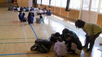 竜巻が来た時の避難の仕方や身の守り方を事前に学び、避難訓練を行いました。