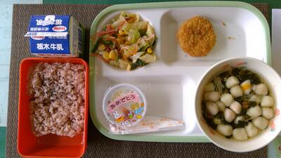 今日の給食は、入学・進級お祝い給食でした。メニューは赤飯、牛乳、春野菜のあえもの、すまし汁、メンチカツ、おめでとうデザートです。