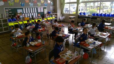 今週月曜日からは、1年生も給食が始まりました。配膳の仕方や片付け方も覚え、自分でできるようになってきました。給食の約束を守りながらおいしそうに給食を食べていました。