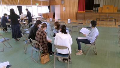 任命式終了後、登校班編成会議を行いました。地区別に分かれて、登校班ごとに集合場所や集合時刻の確認を行いました。また、横断歩道等での道路の渡り方を1年生と一緒に確認しました。