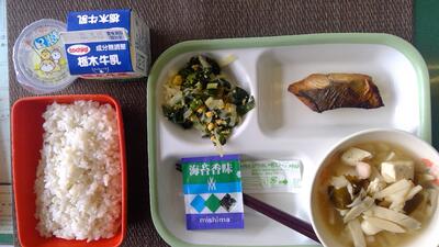 今日の給食は、子供の日にちなんだ給食で、メニューはミナミカマスの照り焼き、菜の花あえ、若竹汁、こどもの日デザート(ゼリー)でした。