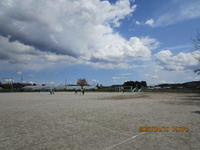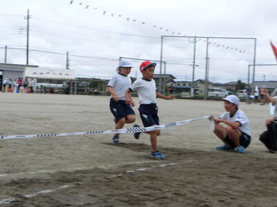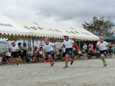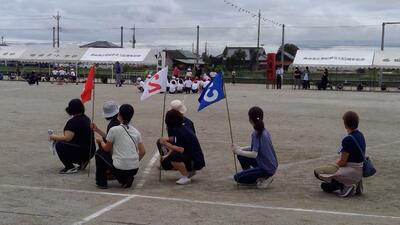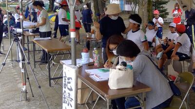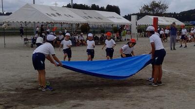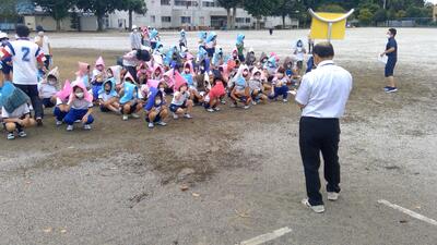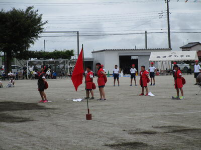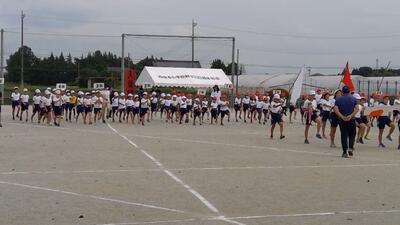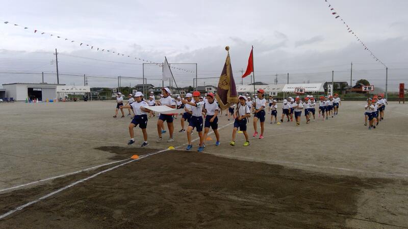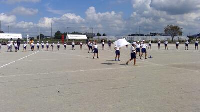 運動会実施が決まり、合図の花火を打ち上げた6時には非常に強い雨が降っていました。校庭は地面が見えるところはないくらい水浸しでした。しかし、児童が登校してくるころにはすっかり雨が上がり、急ぎのグランド整備を行い、何とか予定の時刻に運動会を開始することができました。