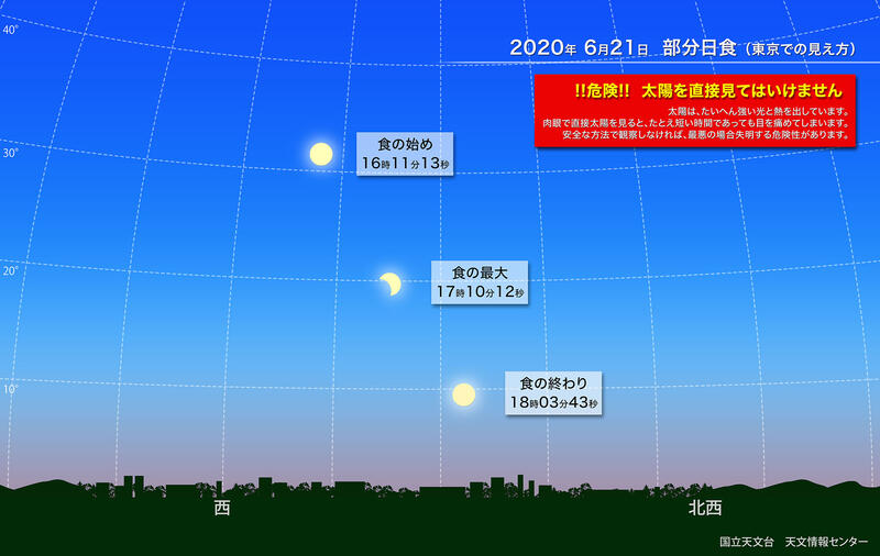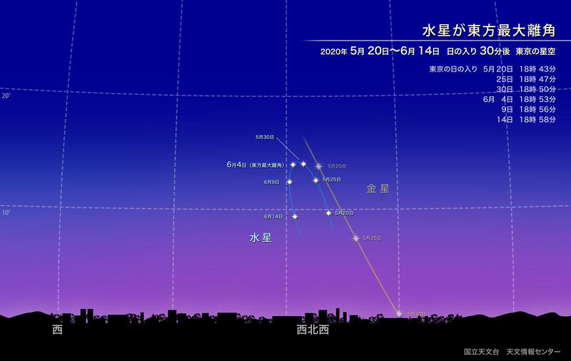 太陽系でいちばん内側を公転している惑星=水星が6月6日に東方最大離角を迎えます。見かけ上、夕方太陽から一番離れて見えますので、一週間くらいは見つけやすくなります。宵の明星=金星と同じように夕方か明け方しか見られない惑星です。薄暮(真っ暗になる前)に探さなければ、すぐに沈んでしまうので、探すのが難しい惑星と言われています。下の図を参考に水星探しに挑戦してみてください。望遠鏡や双眼鏡がなくても探すことは可能です。