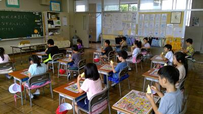 2年生の授業の様子です。5校時に算数で、色板を並べて「きつね」や「家」など様々な形をつくる学習を行いました。