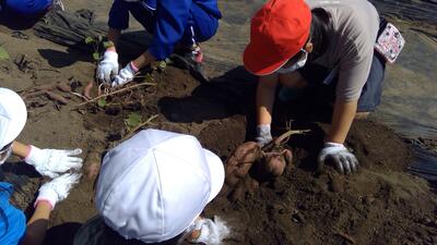 3校時に、1年生と3年生がサツマイモ堀りを行いました。