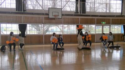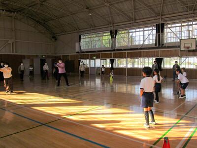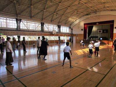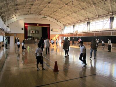 5・6校時に親子レクレーションを実施しました。親子でドッジボールを楽しみました。