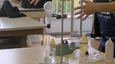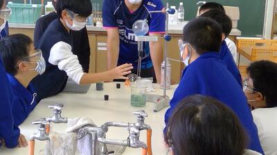 気体のアンモニアはフラスコに入ってきた水に溶け、フラスコ内部は減圧されます。すると、ビーカーからガラス管を通して水を吸い上げ、フラスコの中で噴水のように水が噴き出しました。児童はその様子に驚き、歓声を上げていました。