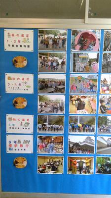 職員室前廊下には各学年の遠足・修学旅行の写真が掲示してあります。