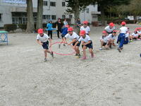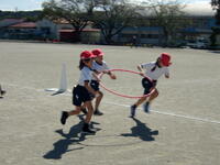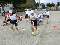 3人一組でフラフープをバトン代わりにもって全員でリレーをします。