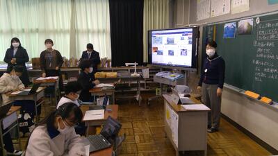 西田井小学校は、今年度、ICT教育重点校に指定されています。今日は、西田井小でのこれまでの取組をもとに、公開授業を行いました。研究授業には、真岡市教育委員会の先生、山前小学校と山前中学校の先生にも参観していただきました。6年生が理科の授業でICT機器を活用して「大地のつくりと変化」の授業を行いました。