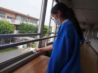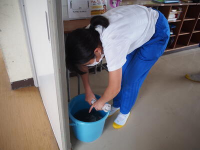 休校中に溜まってしまった汚れやほこりを一生懸命に掃除しています急ぎ
