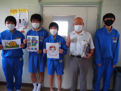生徒の皆さんに『6月のイメージといえば?』と聞いてみたところ、「かたつむり」「あじさい」「ジューンブライド」という答えがあったので、それぞれのイラストを持って記念撮影&河野邉学年主任も『?6歳』おめでとうございます!