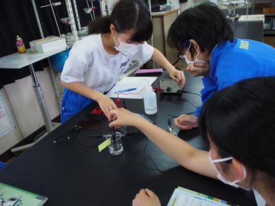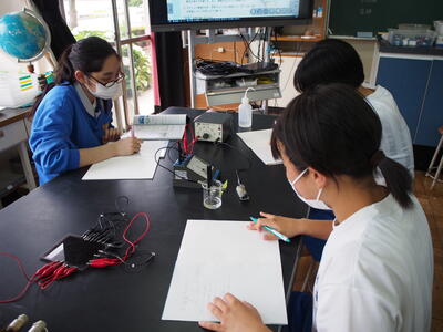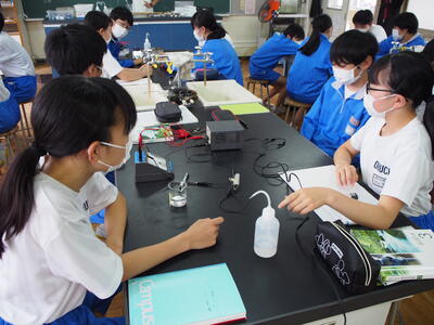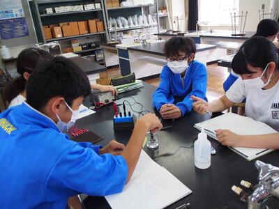 2組の理科の授業では『電気分解する水溶液は何だろう』という謎を解くために、実験を行いました。