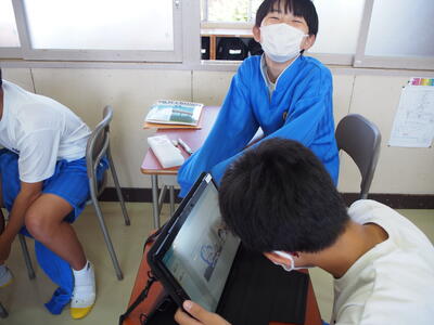 1組の英語の授業では、先日2組が行った、生徒用タブレットを使って日本の漫画のセリフを英語で考えました。