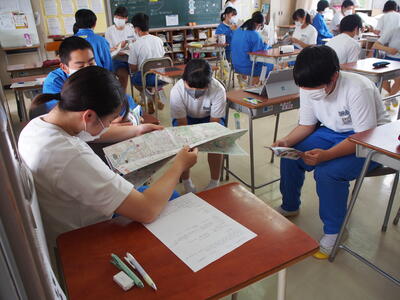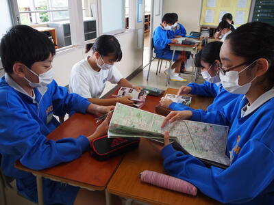 生徒用タブレットで移動距離も調べながら進めています。