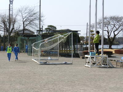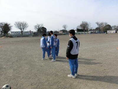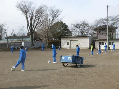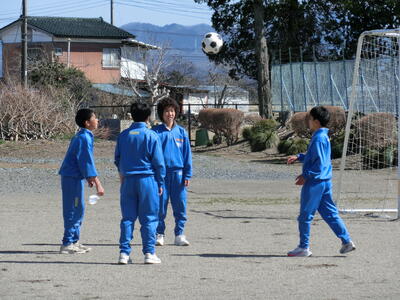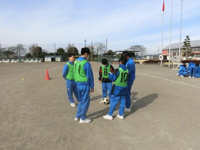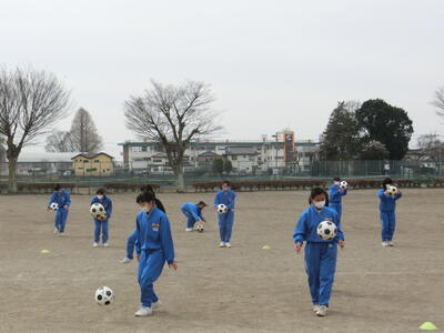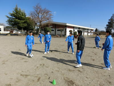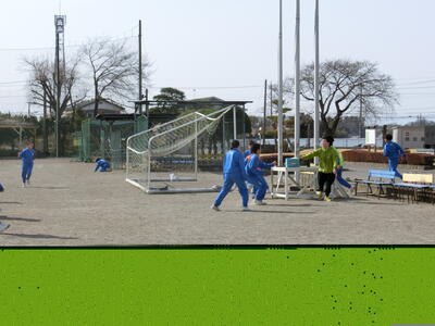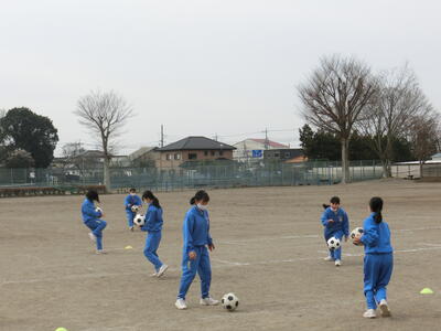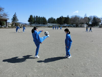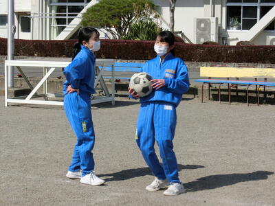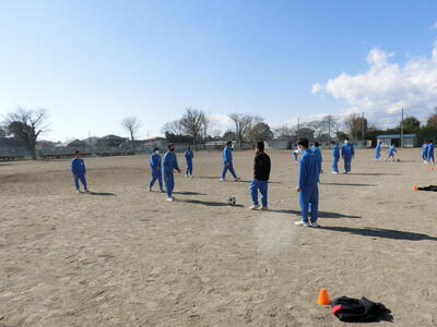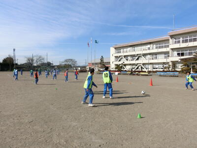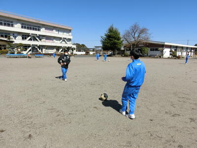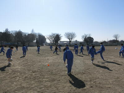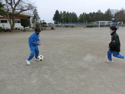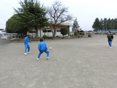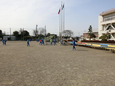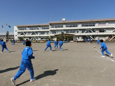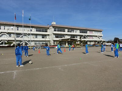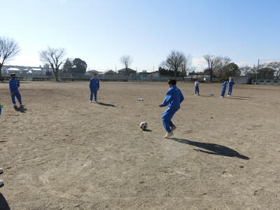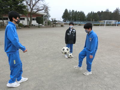 昼休みに、外に出てサッカーをしている生徒が多くいます