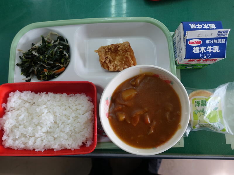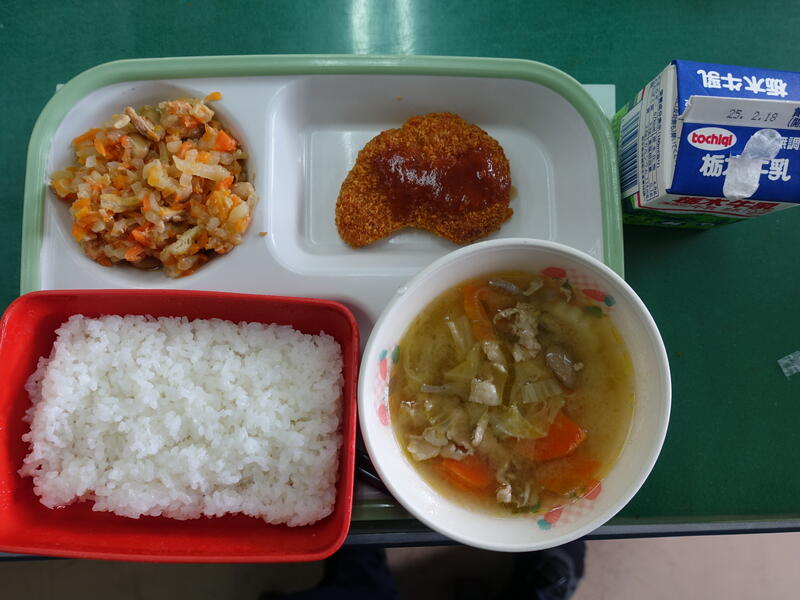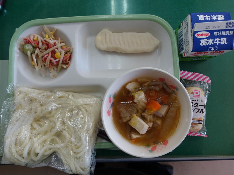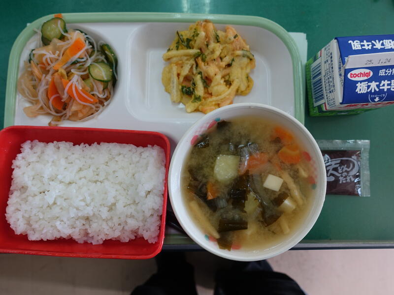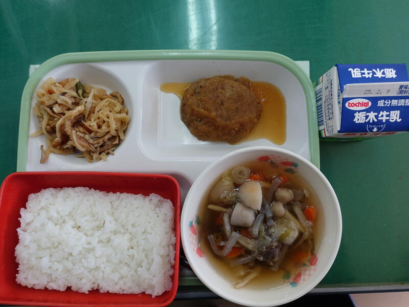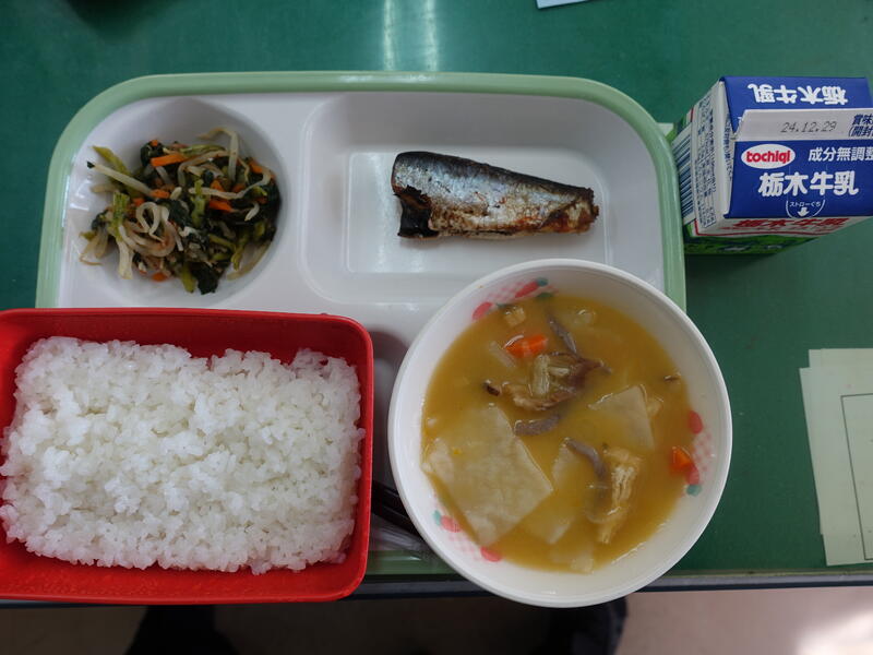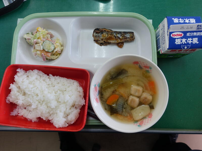 ごはん、牛乳、いわしの梅煮、ゆずドレッシングあえ、ほうとう風ひっつみ汁