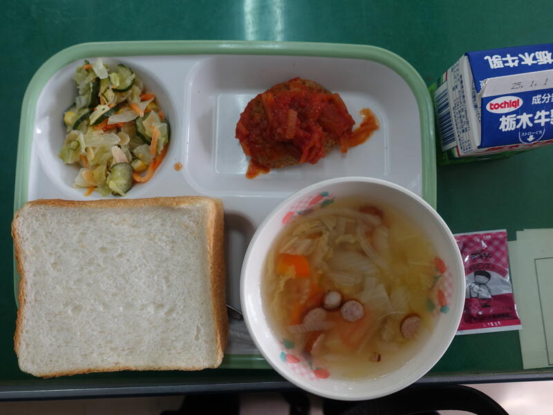 食パン、チョコ大豆、牛乳、ハンバーグのトマトソースかけ、コールスローサラダ、ウインナーと野菜のスープ