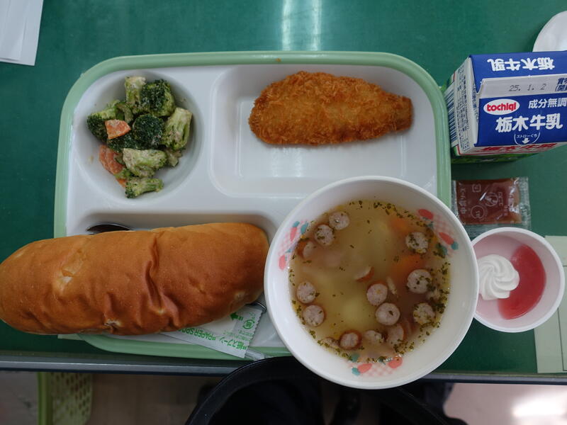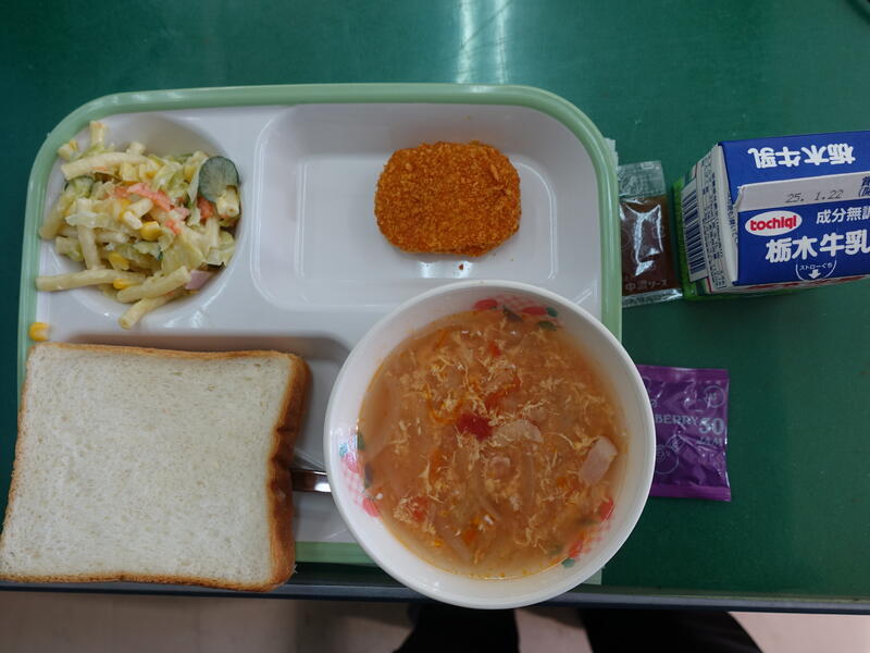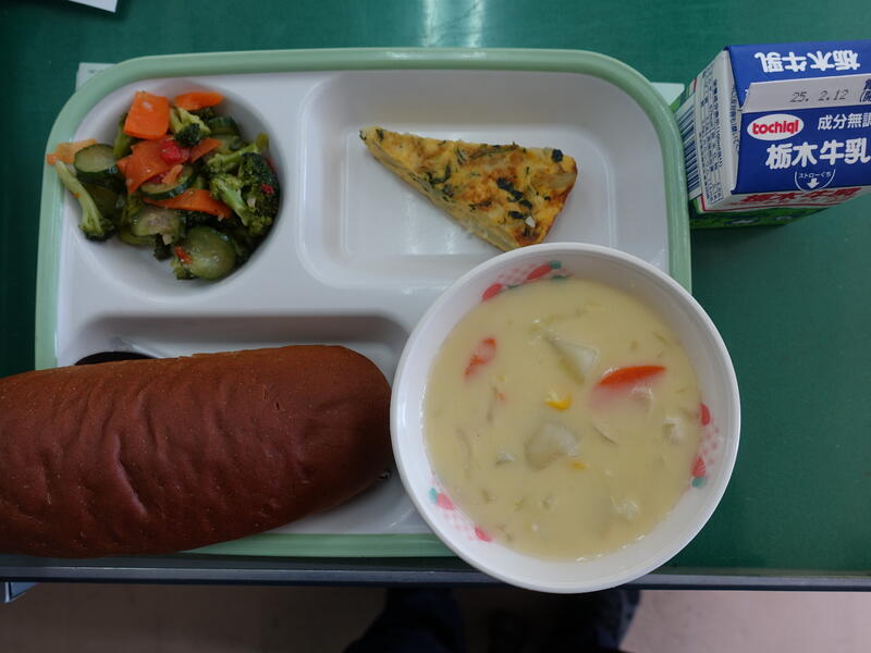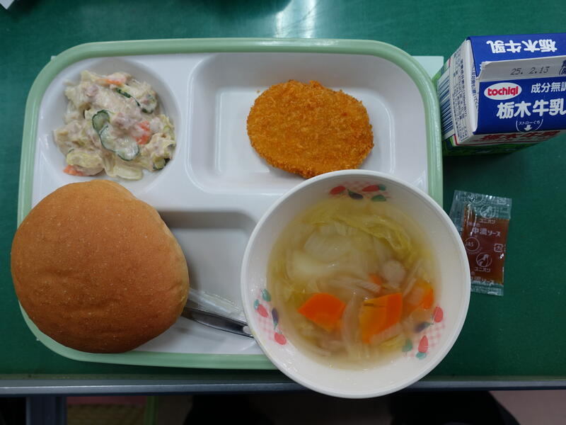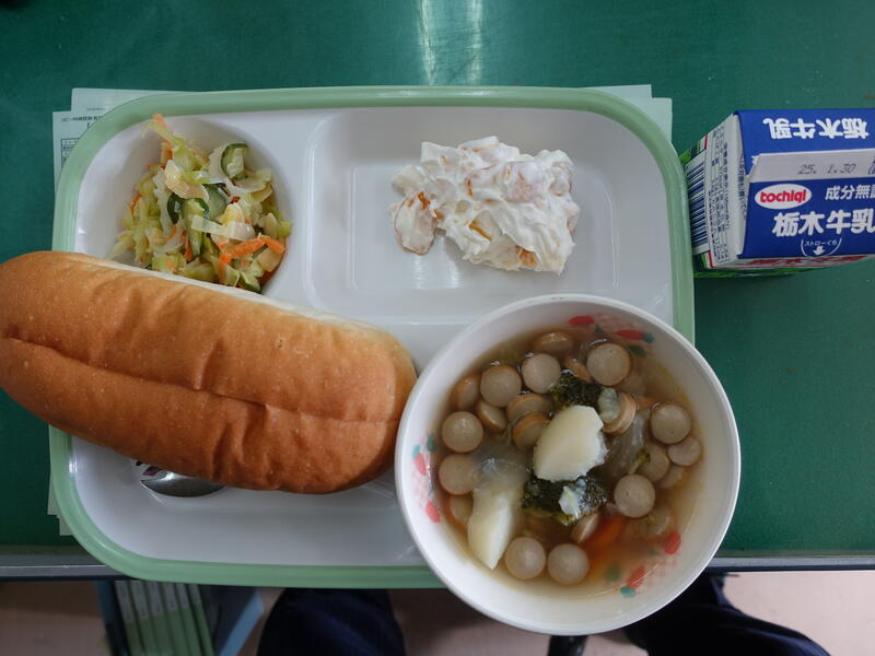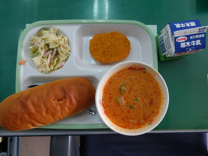 ミルクコッペパン、牛乳、フランクフルト、チーズサラダ、トマトクリームシチュー