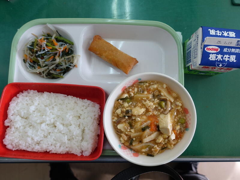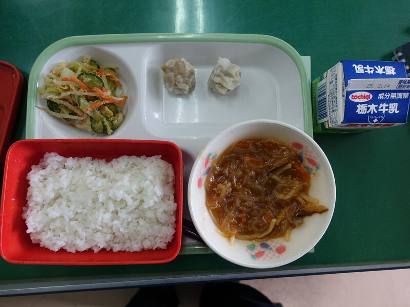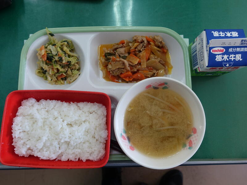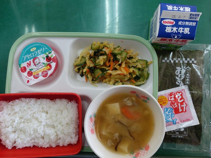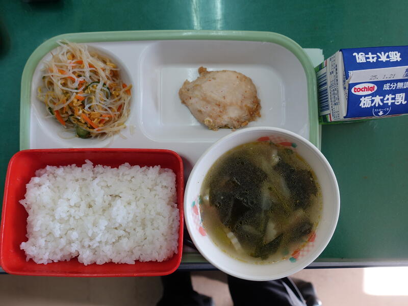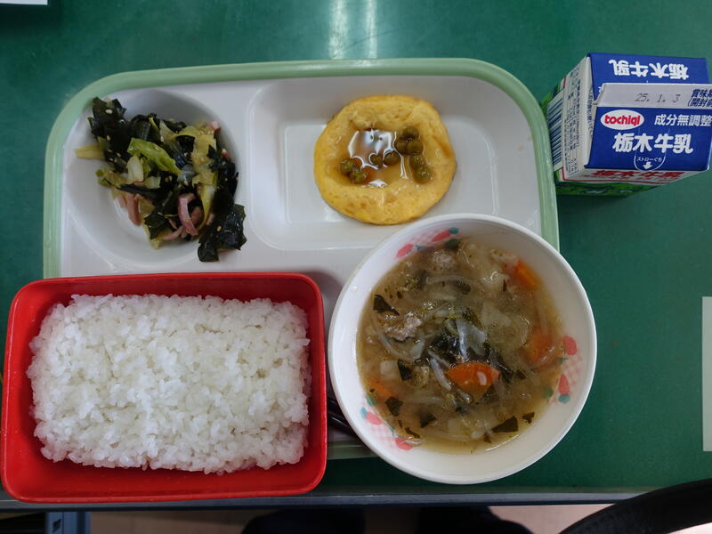 ごはん、牛乳、野菜入り焼き肉、海藻サラダ、なめこ汁