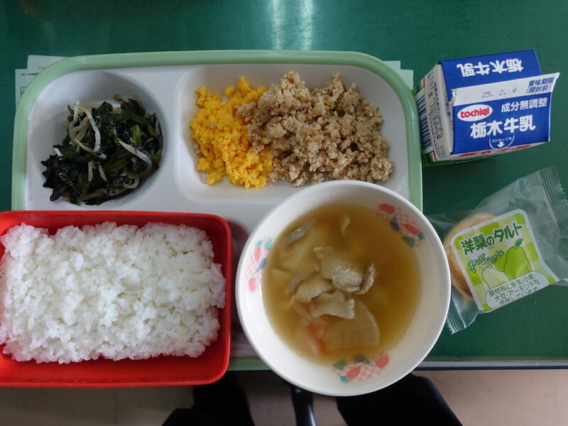 三色ごはん(とりそぼろ・卵そぼろ・ほうれん草)、牛乳、根菜のごま汁