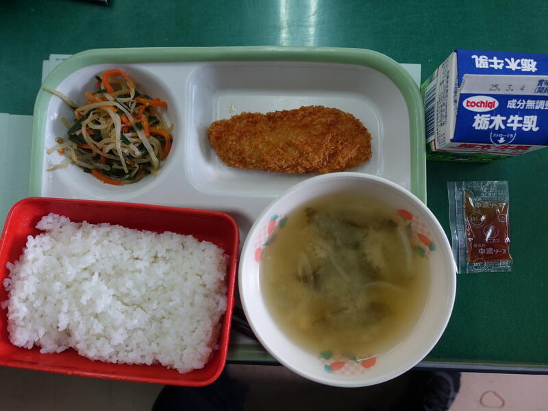 ごはん、牛乳、白身魚フライ・ソース、にらともやしのあえもの、大根とわかめのみそ汁