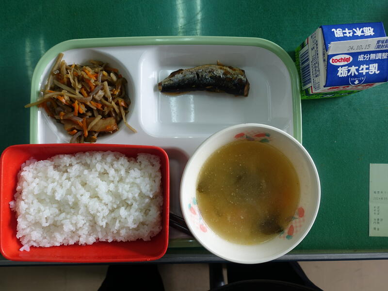 ごはん、のりたま、牛乳、さんまレモン煮、五目きんぴら