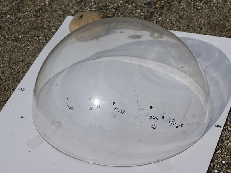 1時間ごとの太陽の位置を透明半球に記録しています。