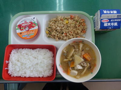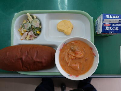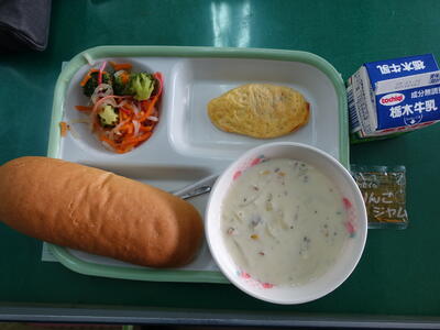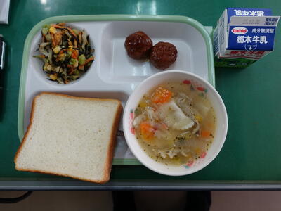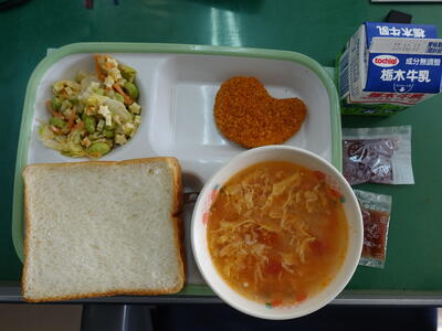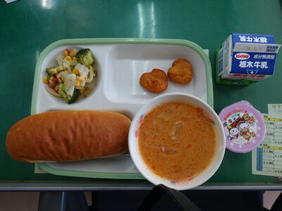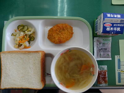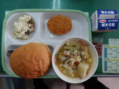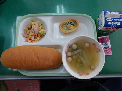 コッペパン、チョコ大豆、牛乳、国産野菜グラタン、ひよこ豆のサラダ、ウインナーと野菜のスープ