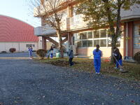 敷地内の落ち葉そうじと、先日緑タイムで植えた花に水をあげました。