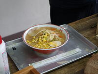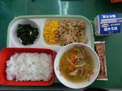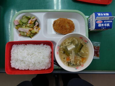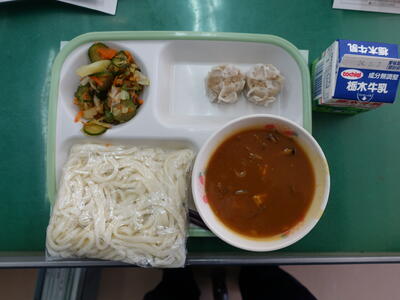 ラーメン、牛乳、餃子ロール、茎わかめのサラダ、タンメンスープ、ウエハースココア