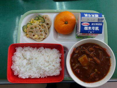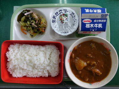 ごはん、牛乳、大根とハムのマリネ、ポークカレー、はちみつゆずゼリー