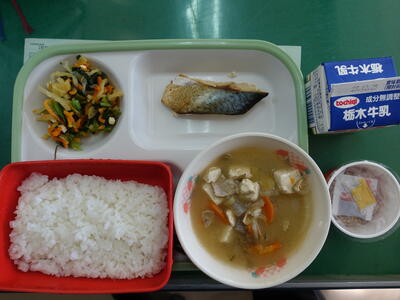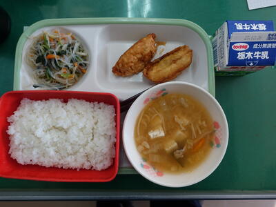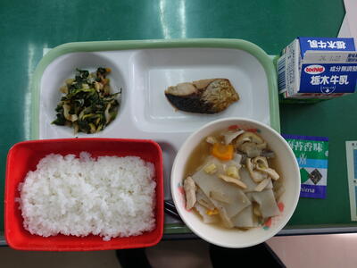 ごはん、牛乳、いかめんち、切干大根とツナのごまあえ、せんべい汁