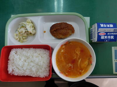ごはん、牛乳、とうふハンバーグ・きのこソース、イタリアンサラダ、コーンポタージュ、いちごクレープ