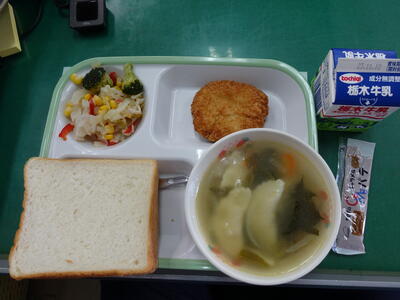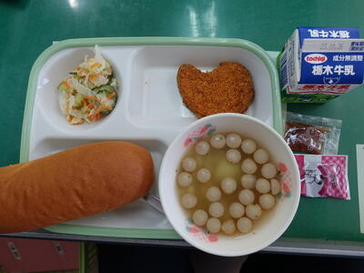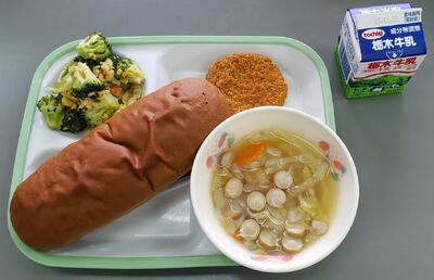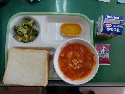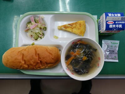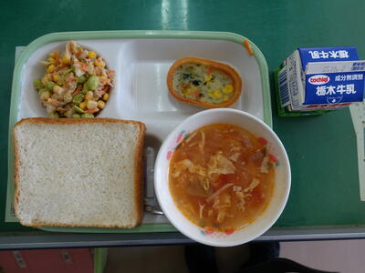コッペパン、牛乳、ミルメークコーヒー、ハートオムレツ、ツナコーン、県産野菜のトマトスープ