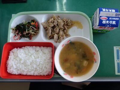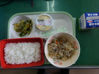 ごはん、牛乳、豚丼、じゃこあえ、蔵の街ヨーグルト