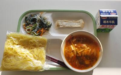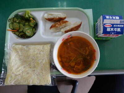 ラーメン、牛乳、餃子ロール、青菜のナムル、マーボーラーメンスープ