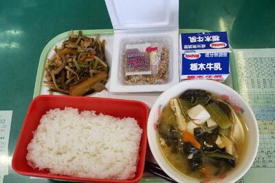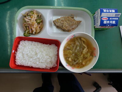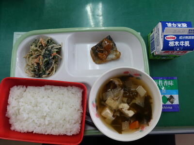 ごはん、味付のり、牛乳、さんまのみぞれ煮、ひじきのごまあえ、さつまいも汁