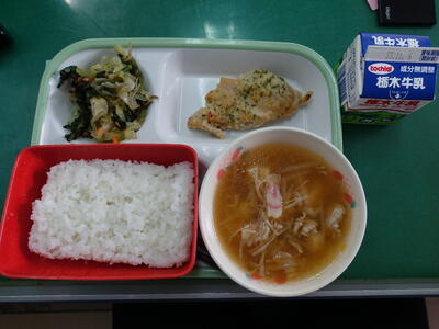 コッペパン、チョコ大豆、牛乳、焼いてチキンカツ・ソース、コールスローサラダ、マカロニスープ