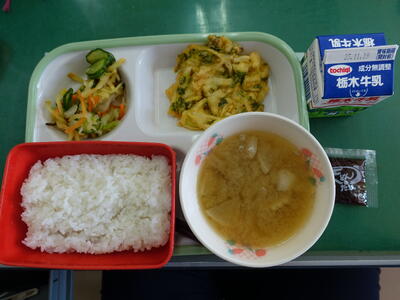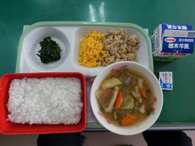 ごはん、牛乳、五目厚焼きたまご、おかかあえ、じゃがいものそぼろ煮