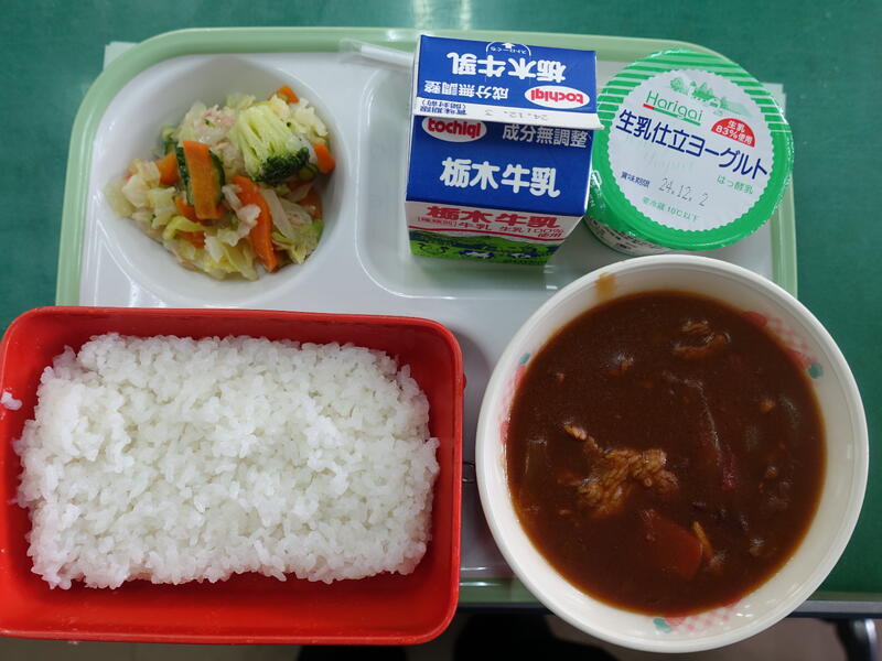 ごはん、牛乳、ハヤシシチュー、さっぱり野菜とツナのサラダ、県産ヨーグルト