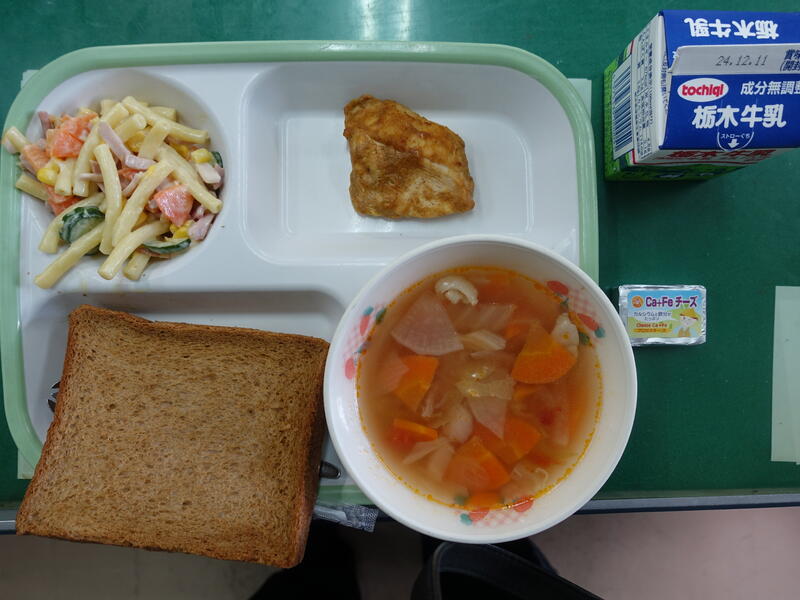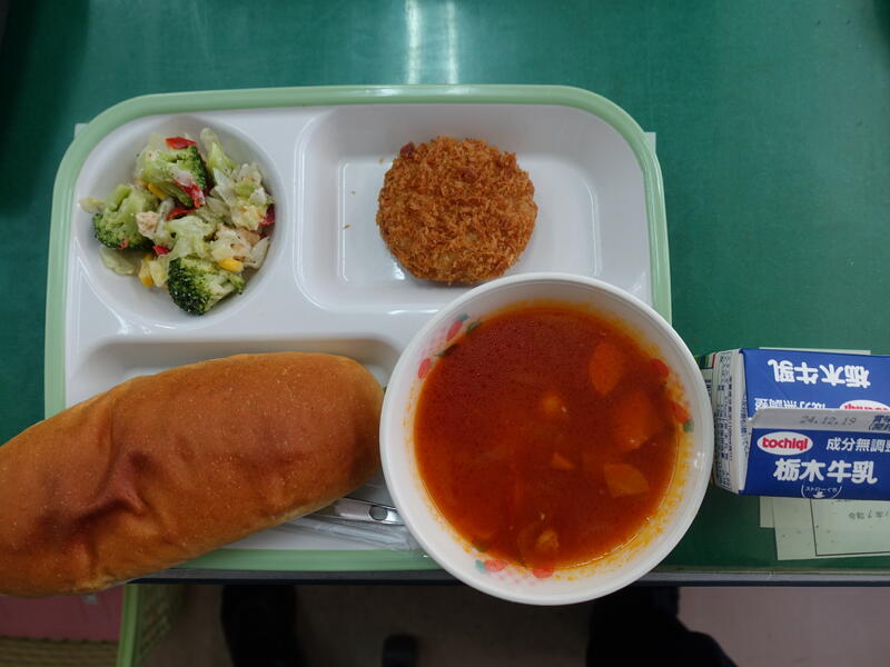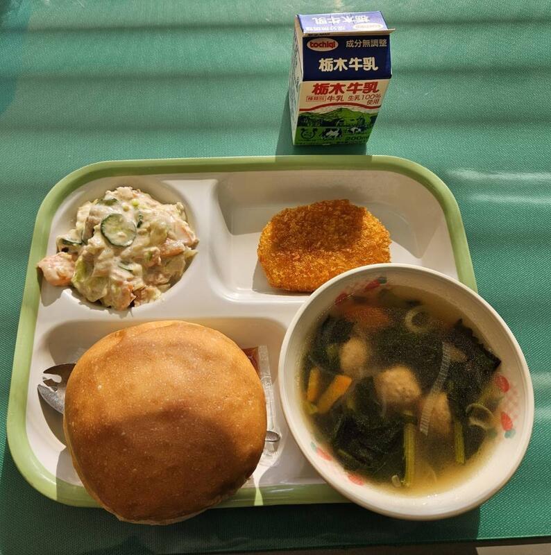 パインパン、牛乳、鮭メンチタルタルフライ、コールスローサラダ、卵と野菜の洋風スープ