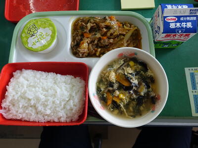 ごはん、牛乳、スタミナ焼き肉、卵ときくらげのスープ、マスカットゼリー