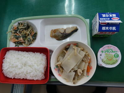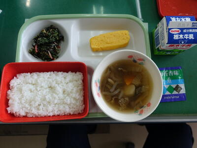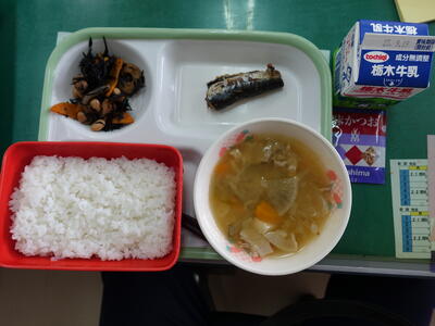 ごはん、味かつお、牛乳、いわしのみぞれ煮、ひじきの炒め煮、豚汁