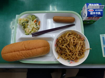 コッペパン、牛乳、フランクフルト、アーモンドサラダ、焼きそば