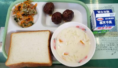 ミルク食パン、牛乳、肉団子②、ペペロンチーノ風サラダ、さつまいもシチュー