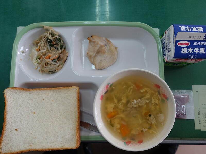 食パン、ミックスジャム、牛乳照り焼きチキン、野菜とツナのサラダ、じゃがいもと卵のスープ