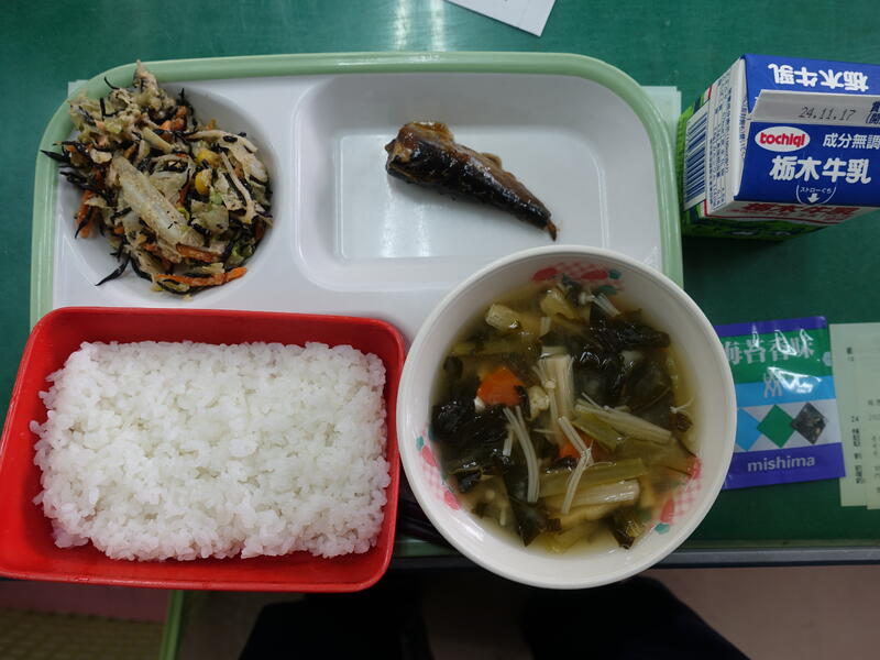 ごはん、のり香味、牛乳、いわしのおかか煮、ひじきのごまあえ、小松菜と油あげのみそ汁