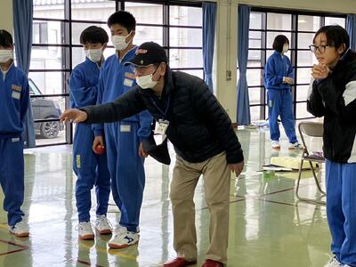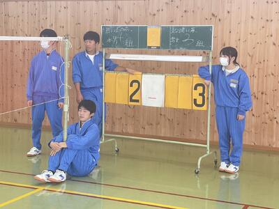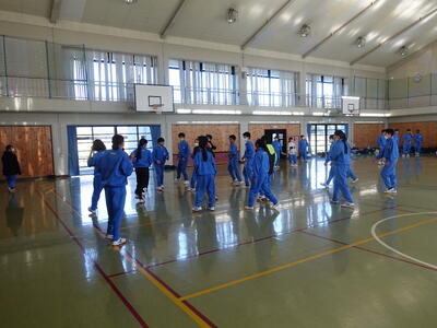 6校時、秋山先生が体育館で1年1組保健体育の研究授業を行いました。