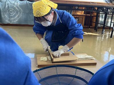1年生は室内でうどんつくりです。
